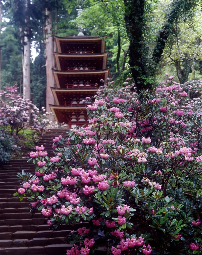 塔の左の道を登ると御影堂(重要文化財)のある奥の院がある。シャクナゲやモミジが境内を美しく彩ることは非常に有名。私は特に五重塔の雪景色が大変可愛らしくて大好きなのだが、紅葉、そしてシャクナゲの季節もやはり素晴らしい。