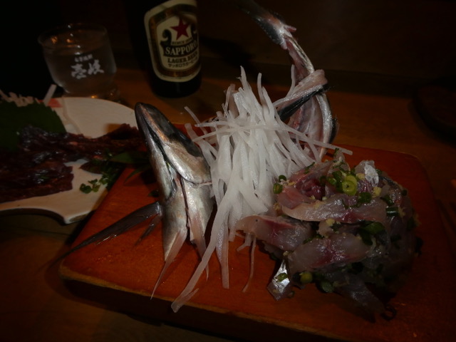 フラッシュが光らなかったが、大きなアジを一匹、お造りで。