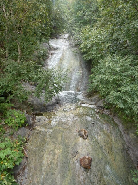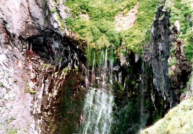フレペの滝は「潜流瀑」というらしいが、滝につながる川は無く、知床連山に降った雨や雪が地面に染み込んで、それが100メートルの高さの断崖の割れ目から吹き出している。