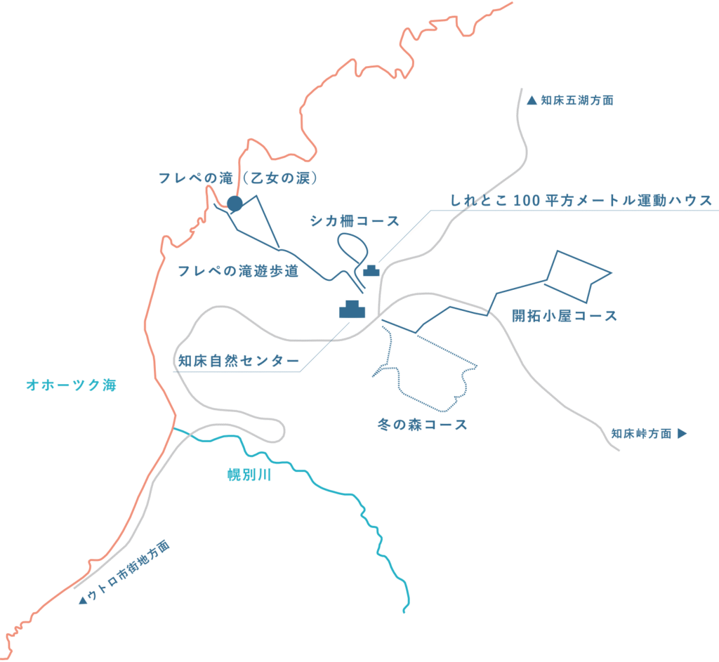 フレペの滝遊歩道は世界遺産知床の代表的散策路の一つ。知床自然センターを起点として、フレペの滝、ウトロ崎灯台、自然園を経由する片道約1㎞(往復2km)がルートに定められ整備されている。