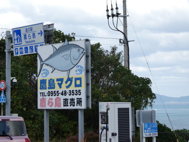 唐津市肥前町から「鷹島肥前大橋」を渡って松浦市鷹島町に入ると、すぐの場所に『道の駅 鷹ら島(たからじま)』がある。「ようこそ鷹島へ」のメッセージと共にフグのモニュメントが設置されているのは、松浦市が養殖トラフグの生産量が日本一だからに他ならない。