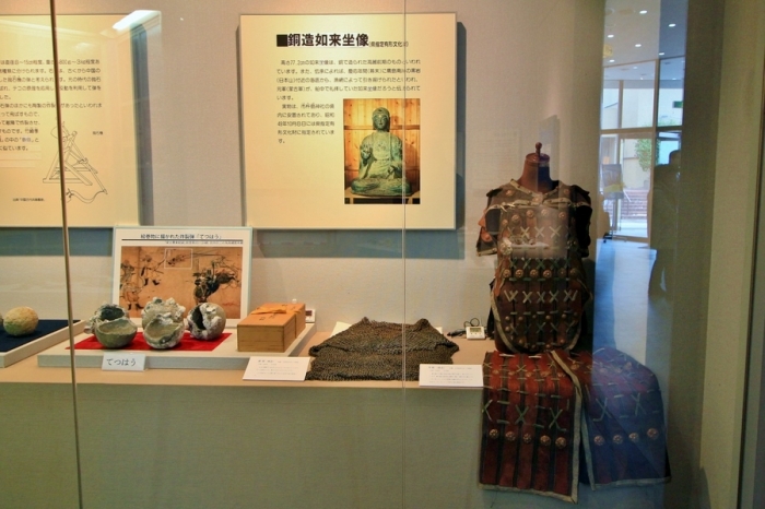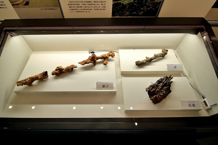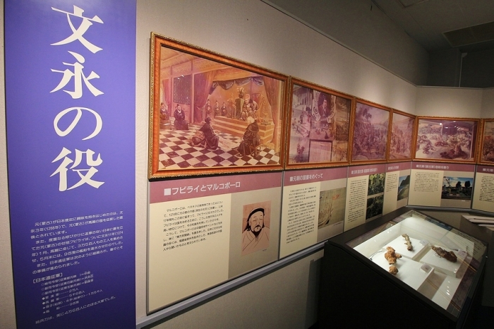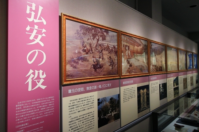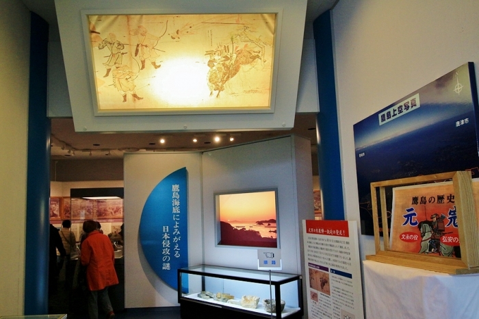 館内では、パネルで「元寇」について分かりやすく解説しているほか、「管軍総把印」(長崎県指定有形文化財)や鉄刀、矛、矢束、古銭、絵巻物に描かれた炸裂弾「てつはう」などが展示されている。