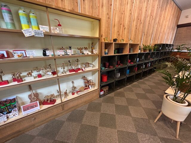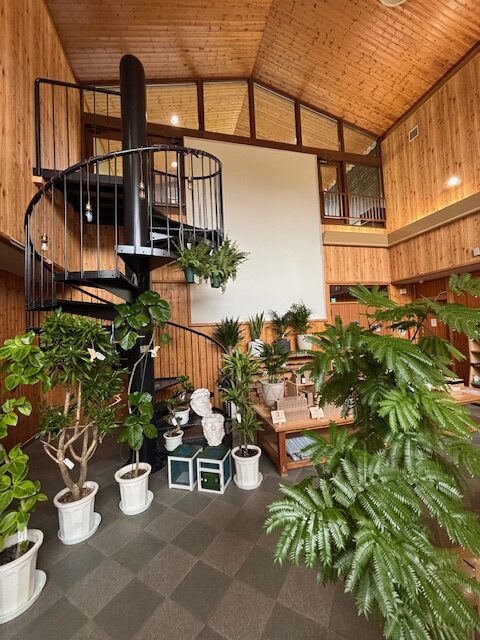 緑豊かな内装の店内に、地元の廃材を活用した什器を配置。サスティナブルな雑貨やアロマ商品、観葉植物を扱うショップとホットサンドやスムージー、ハンドドリップコーヒー等を楽しめるカフェを併設している。