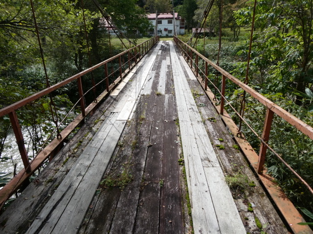 軽自動車なら通れそうだが、普通車は車種によっては通りかねる細い吊橋だ。
