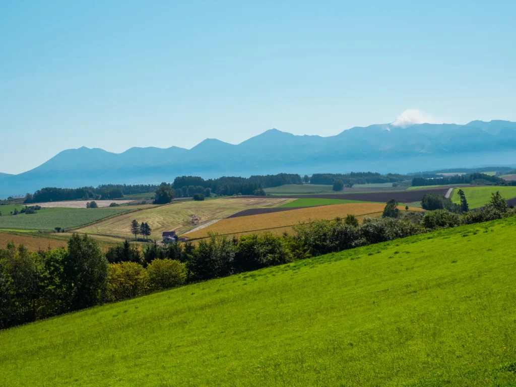 南西には芦別岳と長閑な田園地帯が広がる。また北西には、パッチワークの路の景観が広がる。