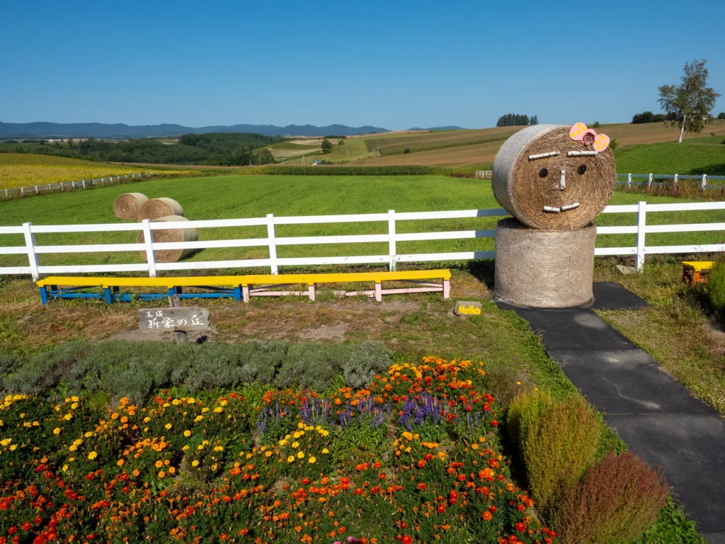 牧草ロールを積み上げた人形が目印の公園で、丘陵から美瑛の自然豊かな風景を、遮るものなく360度のパノラマで一望できる。
