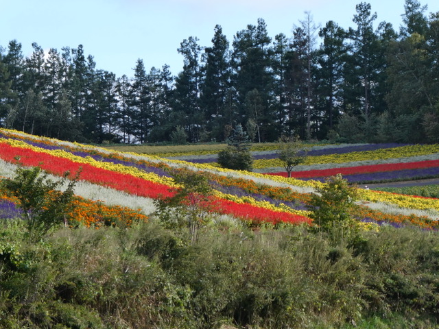 10月に入ると、花畑の奥に見える山々が赤や黄色に色付きはじめて、花畑と紅葉のコントラストが美しくなっていく。