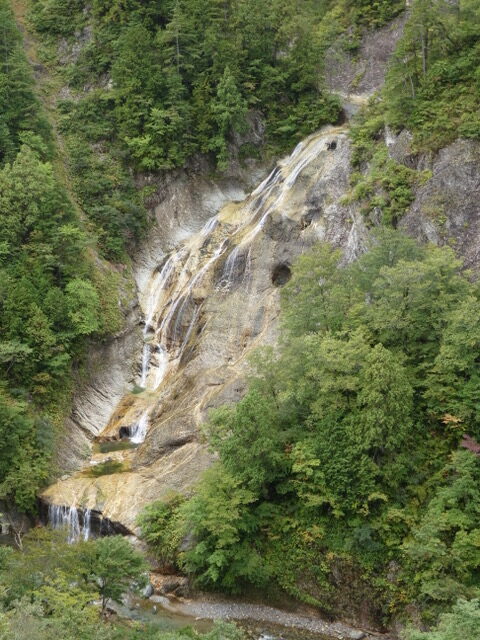 まず深い谷からのきつい上りを走っていくと「日本の滝100選」にも選ばれている姥ヶ滝(うばがたき)、落差約86mの「ふくべの大滝」など、大小7つの滝が織りなす峡谷美を楽しむことができるが、石川県側に見られるこれらの景勝地はすべて「庄川火山〜深成複合岩体」の火山岩石が作り出す景観ということだ。