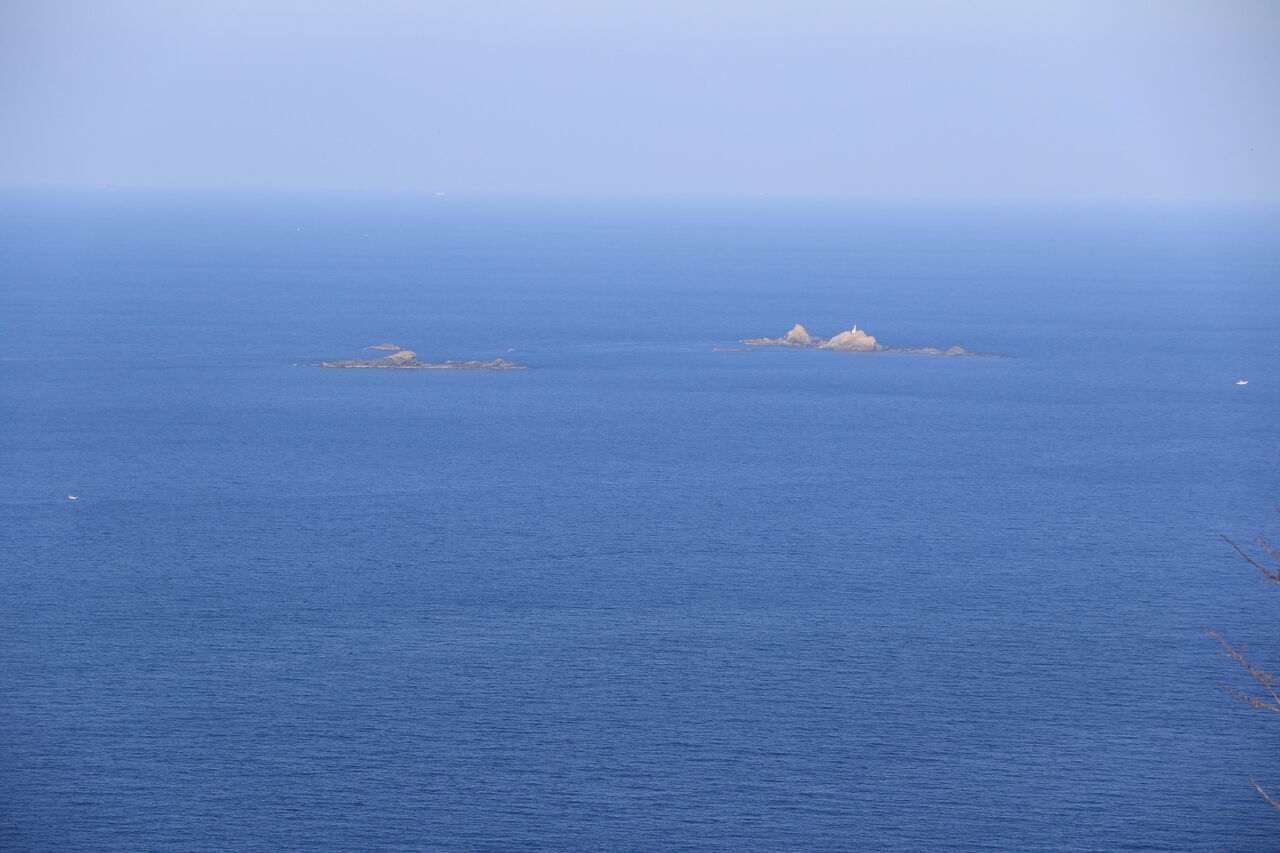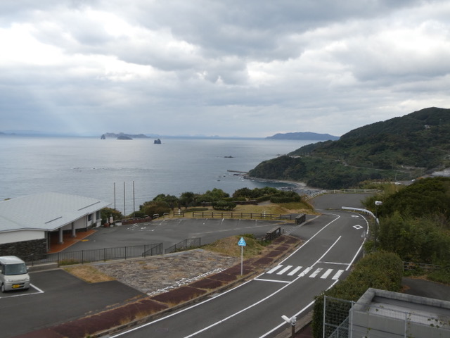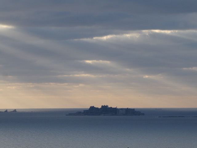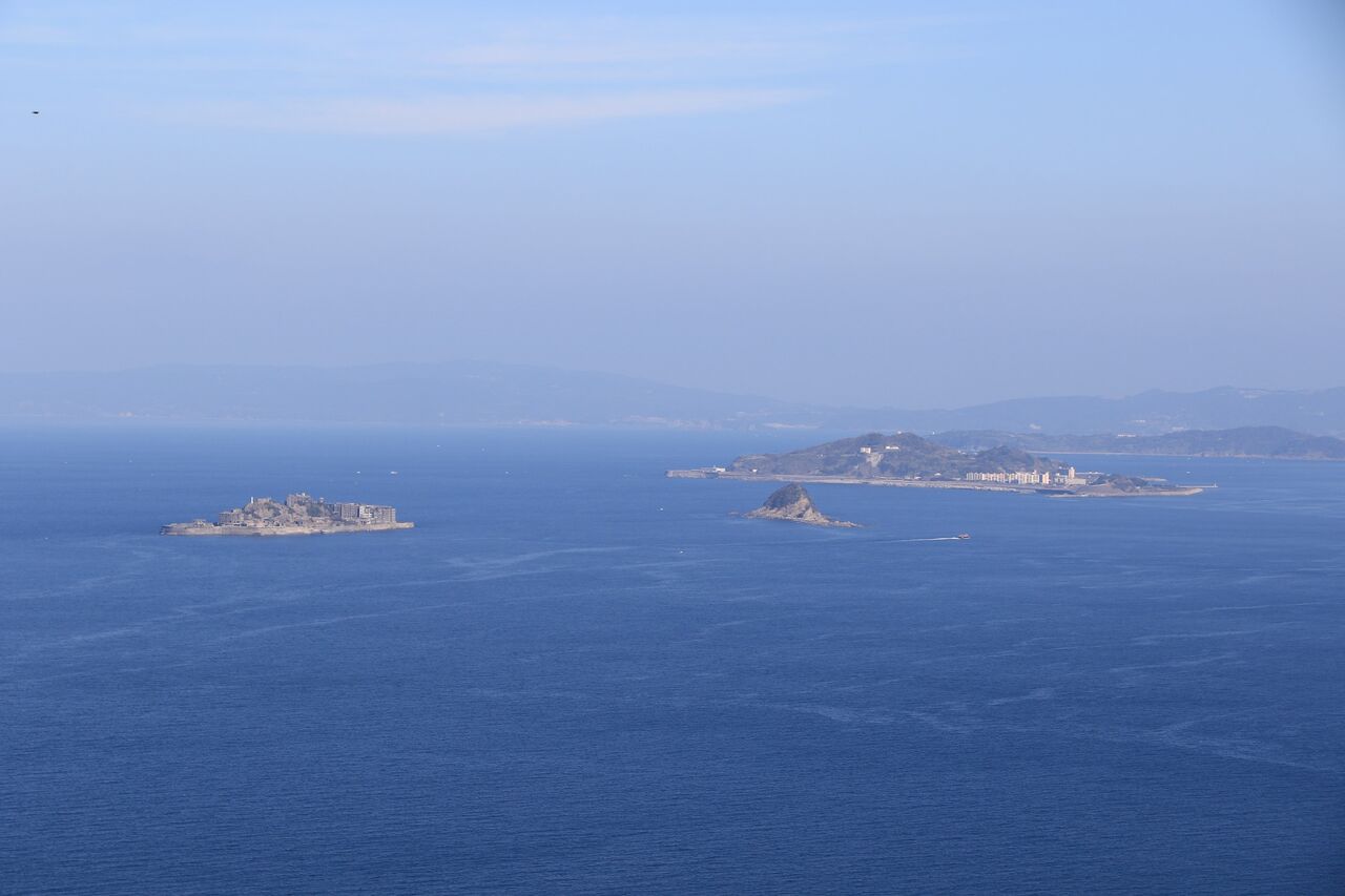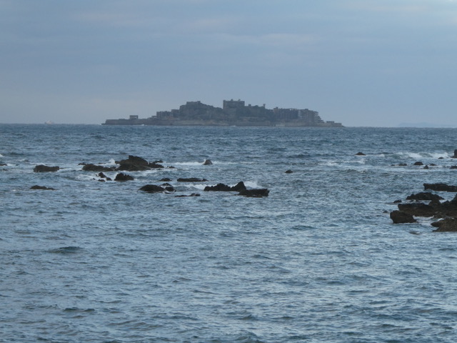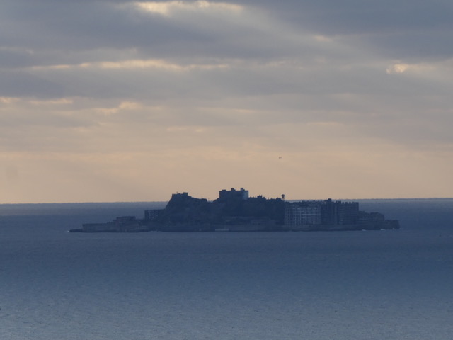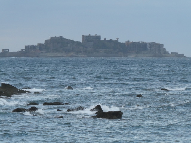 国道202号線から499号沿いに、美しいリアス式海岸、角力灘の景色を見ながら延々長距離ドライブを楽しむと、軍艦島は遠く、ほぼ常に視界に入ったままだ。