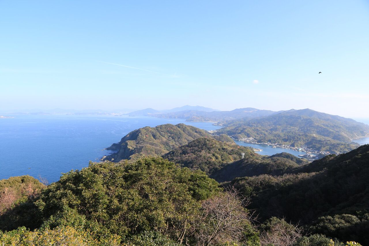 右中央の入り江が野母崎港、奥に長崎市が遠く見える。