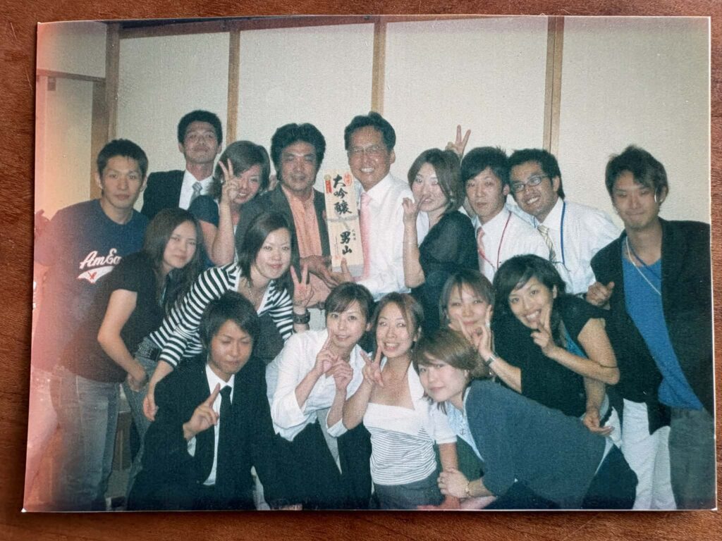 下写真後列中央で「大吟醸 男山」を持っているのが男気の塊、柏木社長。その横で柏木に密着してピースしているのが、20数年前の美沙登である。