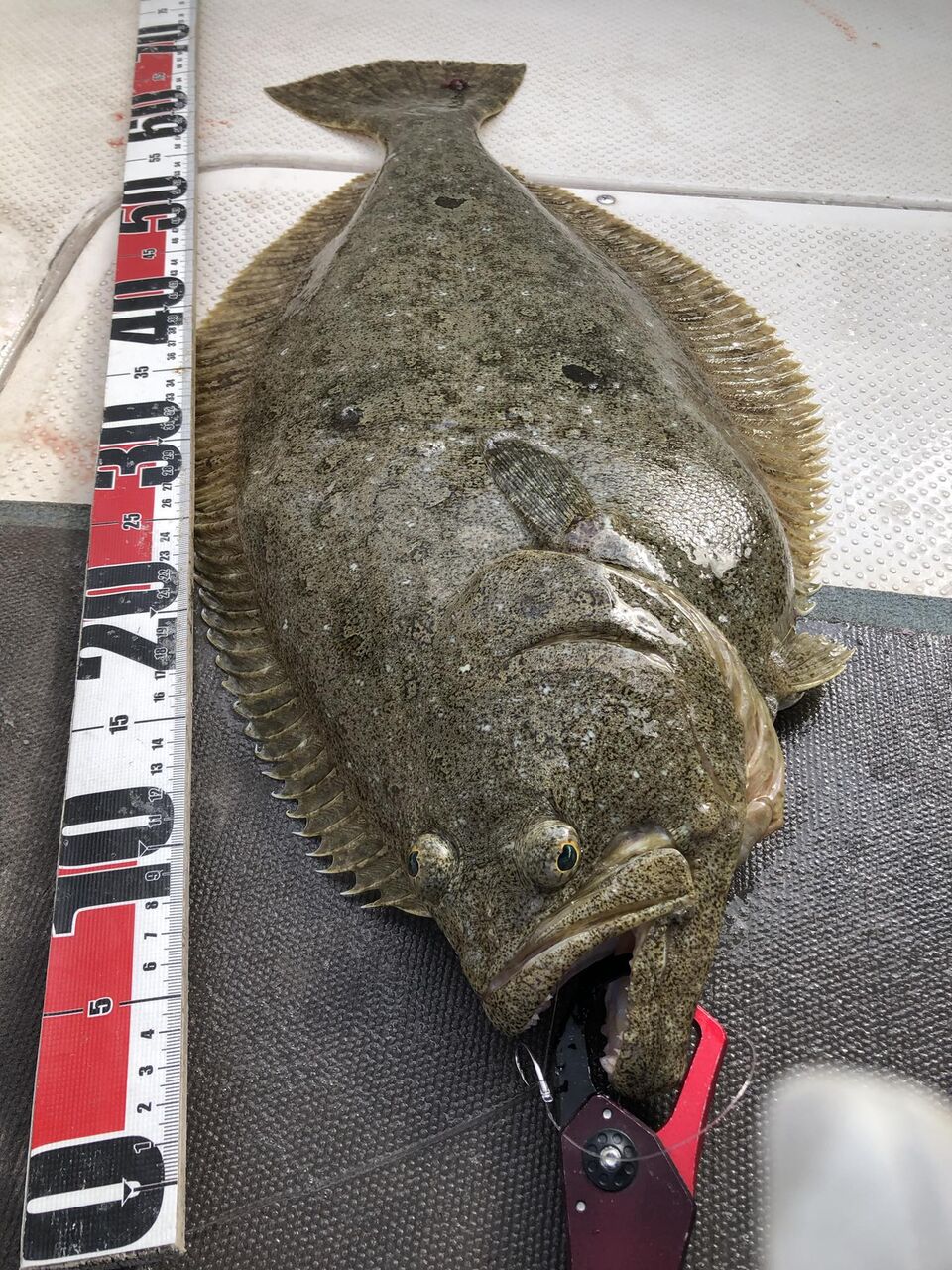 居るのは判ったので同じラインを再度流す、辛抱して待っていると狙い通り前アタリが出た。ヒラメ40と言われるけれど、そこまで待てないが自分的には充分待ってフッキング。乗った!強烈なファーストダッシュにオシコン201HGのドラグが滑る。何度も反転して走るので青物?と思ったくらいの好ファイトで寒ヒラメ70cm/3.5kgをランディング。先日の目前バラシに凝りて、水面で空気吸わせて大人しくなってから手網入れした。
