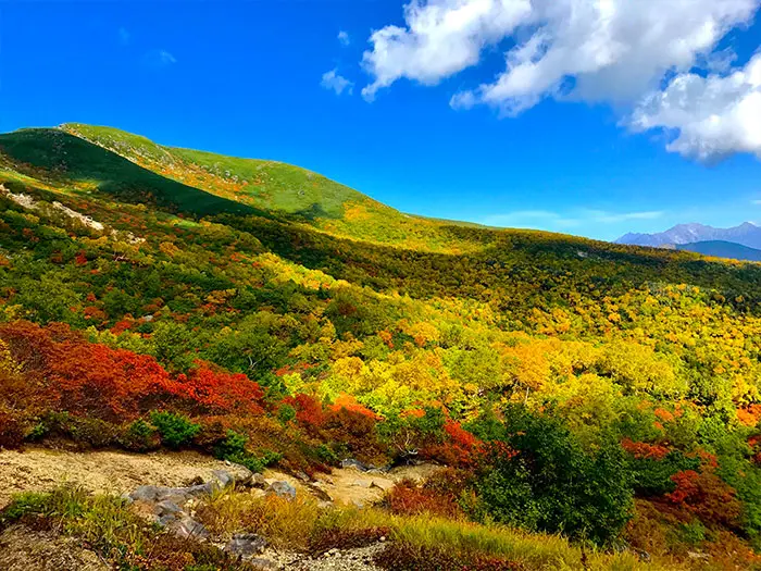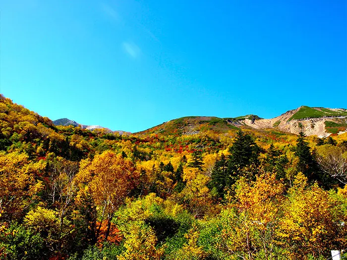 乗鞍岳は、北アルプス随一の広大な裾野を持つこと、そして麓から山頂までの高低差によって長い期間紅葉を楽しむことができることで有名だ。