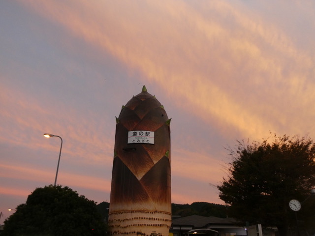 道の駅ので圧倒的な存在感で目印となっているのは、巨大なたけのこのモニュメント。 直径は4m、高さはなんと13.5mもあるらしい。