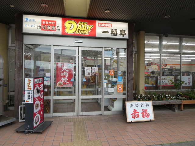 物産館の入口には「ニューデイリーストア」と書かれたコンビニの看板。