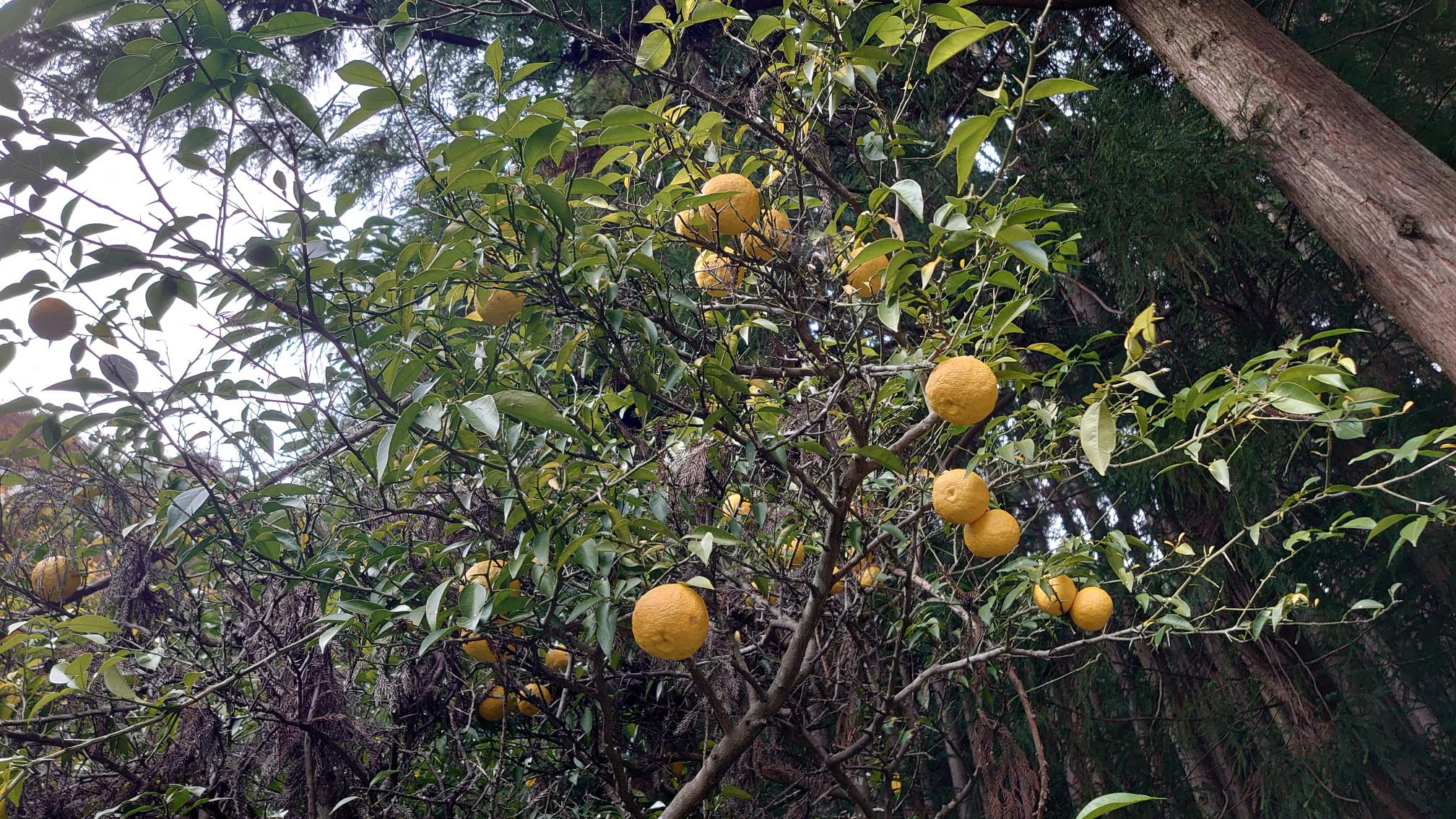 整備された登山道を歩き始めるとすぐに杉林が広がる静かな山道に入るが、その手前、両神山荘を出たあたりには、柚子が実っていた。