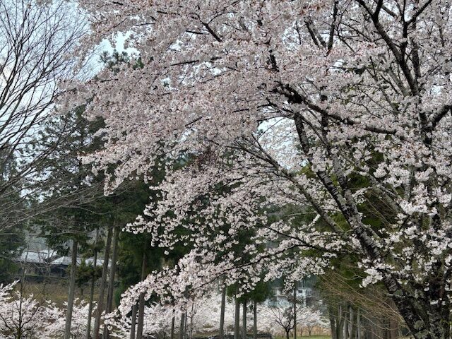雨上がりに、山々や白川から発生した霧が桜と村を覆う幻想的な景色はとても美しい。