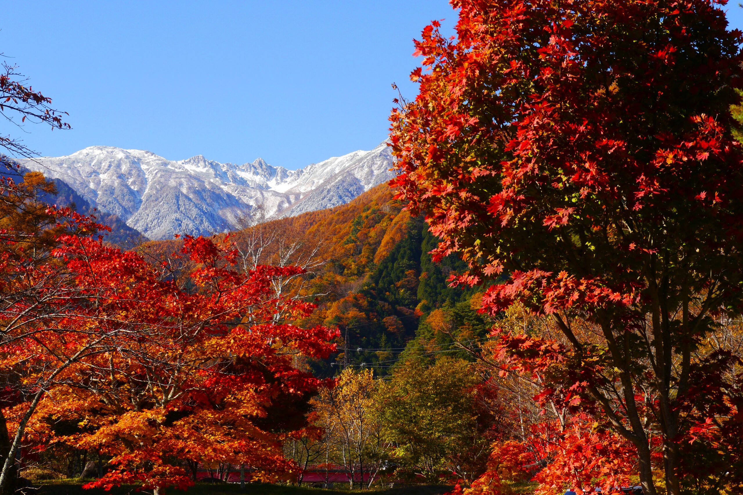 駒ヶ根市の紅葉シーズンは、標高2,600m超の中央アルプス山頂の冠雪、つまり雪景色を背景に、麓の駒ヶ根高原へと徐々に色が移り変わっていく様を奇跡的なワンショットで見ることができる「三段紅葉」が最大の特徴だ。