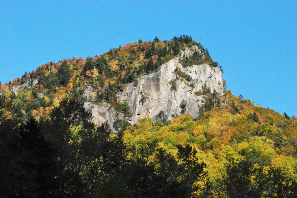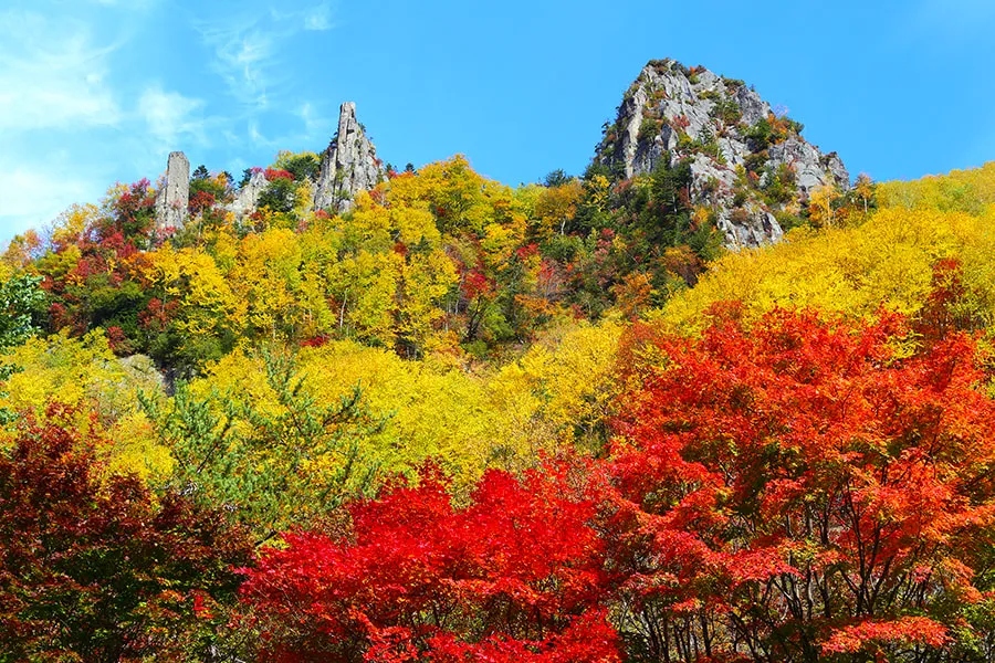 黒岳沢の岩肌に立ち並ぶ木々の紅葉と、無機質な岩肌とのコントラストがとても美しい。