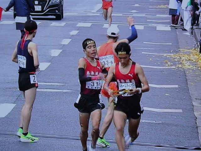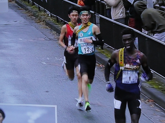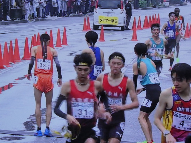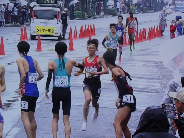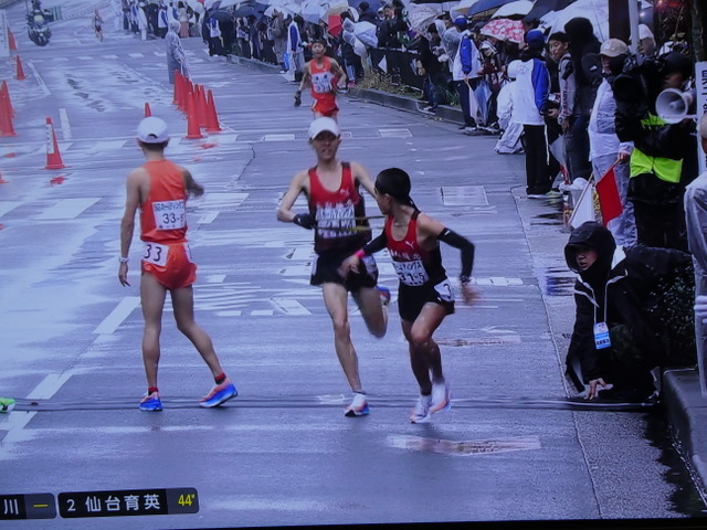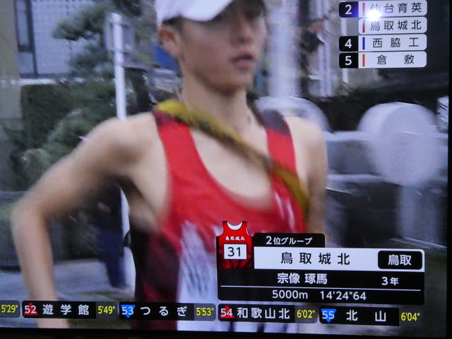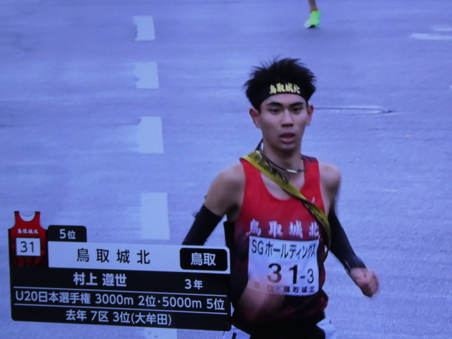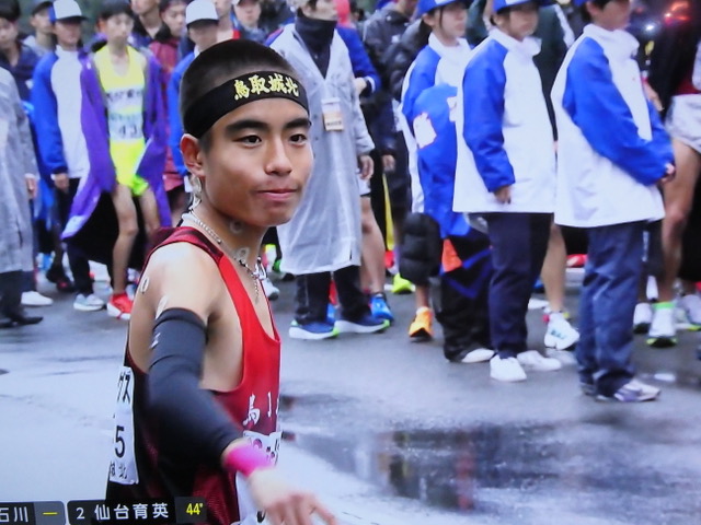 そして、福島県代表・学法石川の益子選手が歴代日本人最高記録での快走。西脇工業が続き、そして鳥取城北は本田桜二郎くんが3位と粘って、先頭と32秒差で二区にタスキを渡した。