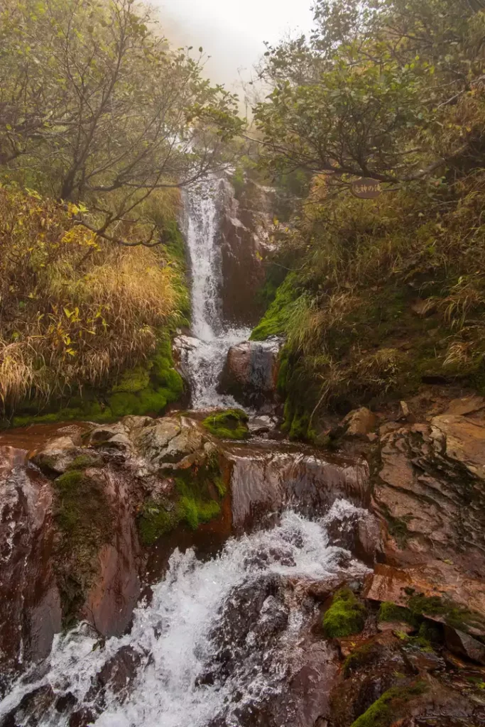 この滝と最上部の霊華の滝は、大きな岩脈の上に沢筋が形成されたもので、これらは階段状のなめ滝だ。