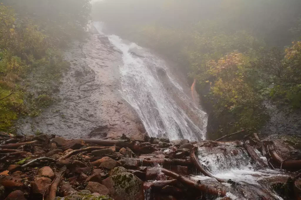 岩脈とは、山体の中を上昇してきた溶岩が冷却され、斜里岳火山体の骨と考えられる構造を形成しているものだ。「見晴らしの滝」と「竜神の滝」は、その岩脈が堤防のような役割を果たしていて、垂直に落下するタイプの滝となっている。