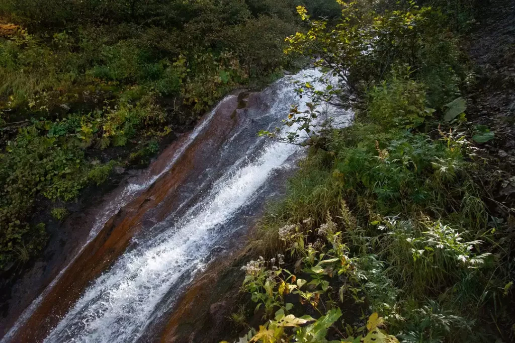 斜里岳には、3つのタイプの滝があって、上写真の「羽衣の滝」、「水連の滝」、そして「方丈の滝」は、溶岩流の板状節理の上を水が流れることによってできた「なめ滝」で、20~30度の傾斜で流れ落ちている。