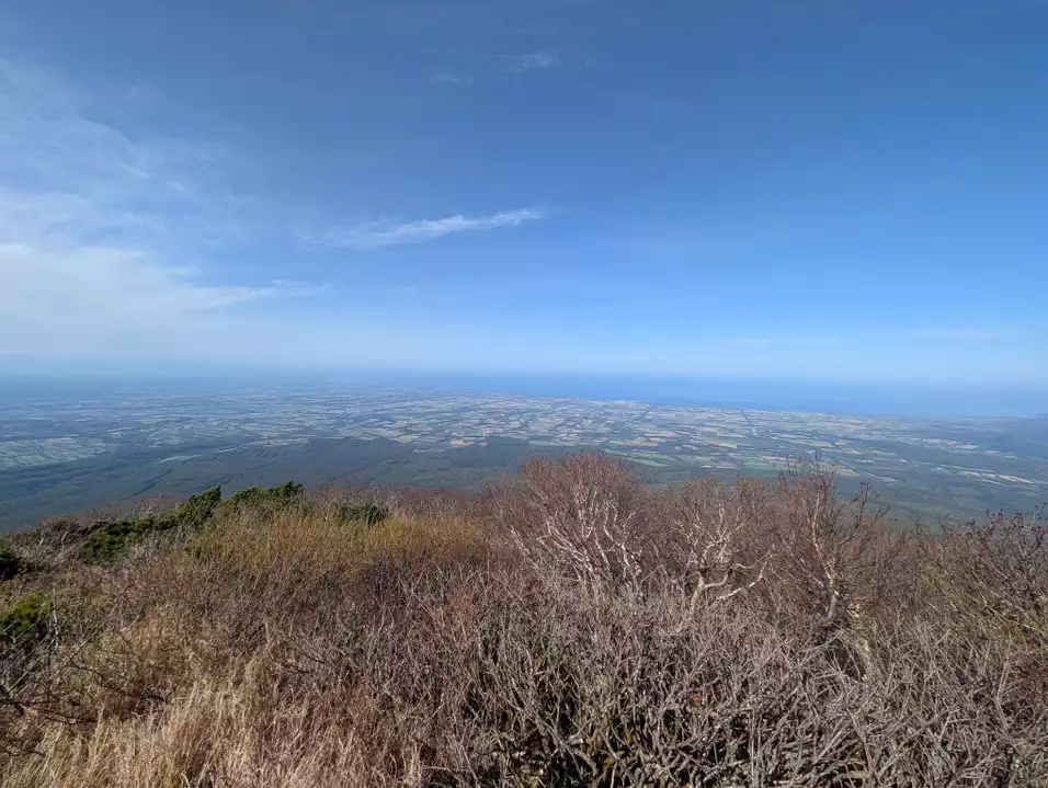 車を停めた清岳荘の前から清里町が望めるし、ここからすでに海も見える。ここから登っていかずとも、と腰も引けたが、まあ行けるところまで行こうと。
