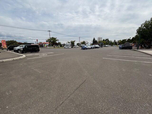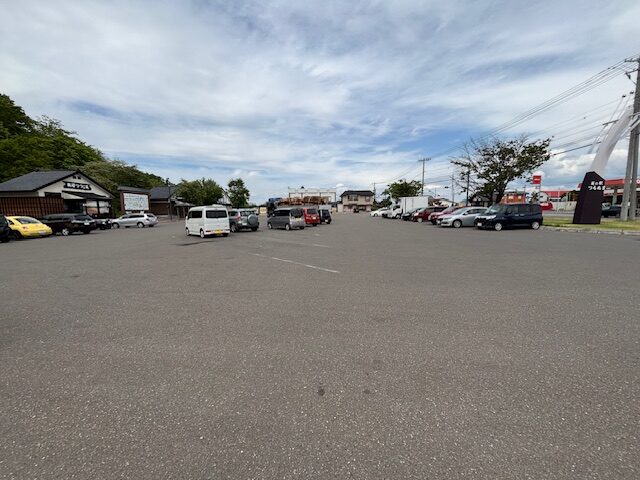 温泉施設の、道を挟んで向かいにも非常に広い駐車場がある。